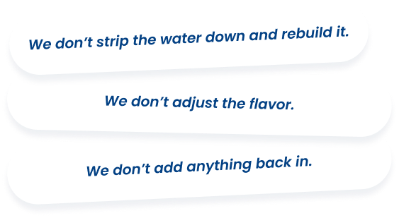 Many water brands add minerals, electrolytes, or other ingredients to change how their water tastes after heavy processing. We don’t.